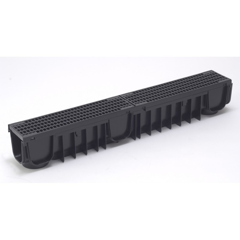 Longueur 1m, largeur intérieure 104 mm, avec deux grilles en polyamide pour le passage voiture, B125 et PMR. Conforme à la norme EN1433.