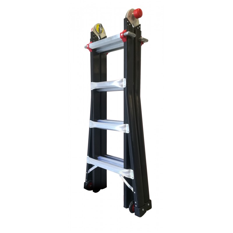 MULTI-POSITIONS : Escabeau, Echelle d'escalier, Echelle droite - Base évasée avec sabots anti-dérapant - Echelle ultra-compacte avec montant robuste - Charnières à blocage automatique - Roues de transport - Garantie 3 ans -