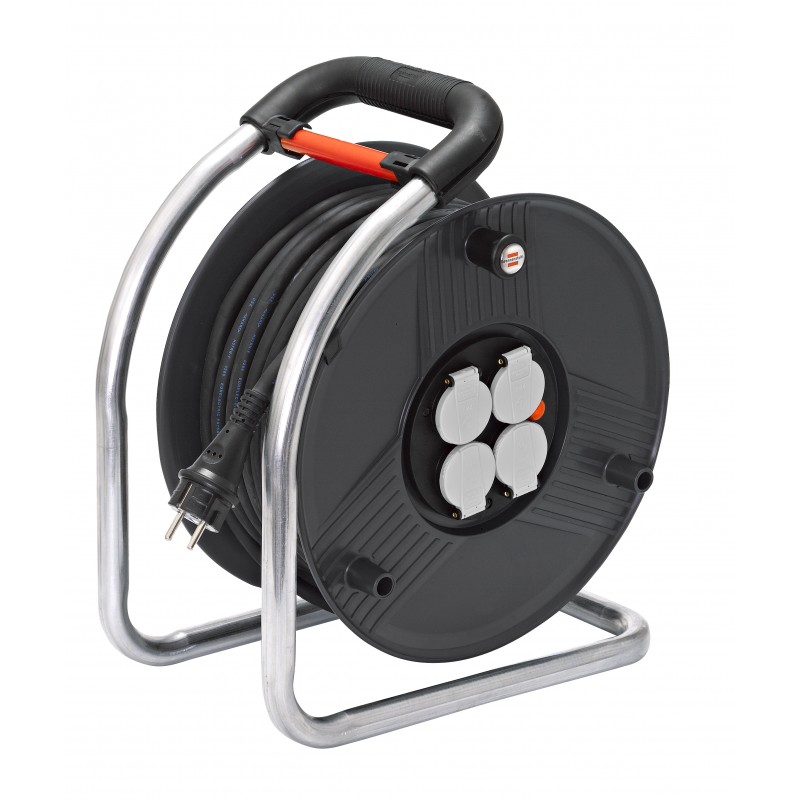40 m de câble H07RN-F 3G2.5, 1fiche 2P+T 16A/230V, 4 prises 2P+T 16A/230V à clapet, IP44, disjoncteur thermique, protection enfants.