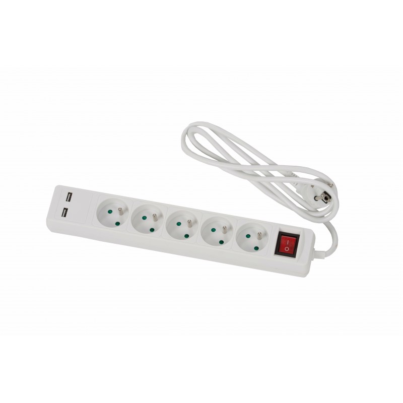 Bloc 5 prises 2P+T 16A 250V + 2 prises USB blanc avec interrupteur - 1,5m de câble H05VVF 3G1 - IP20 - puissance maximum de 3500W sous 230V