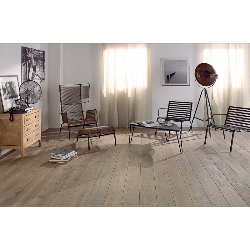 Pour faire honneur à la lumière qui l'effleure, le sol revêt ses plus beaux atours. Le chêne, légèrement teinté d'une nuance raphia naturel, révèle alors tout le caractère d'une pièce. Ce parquet en bois clair s'inscrit dans un style épuré, pour habiller un bureau ou une chambre.