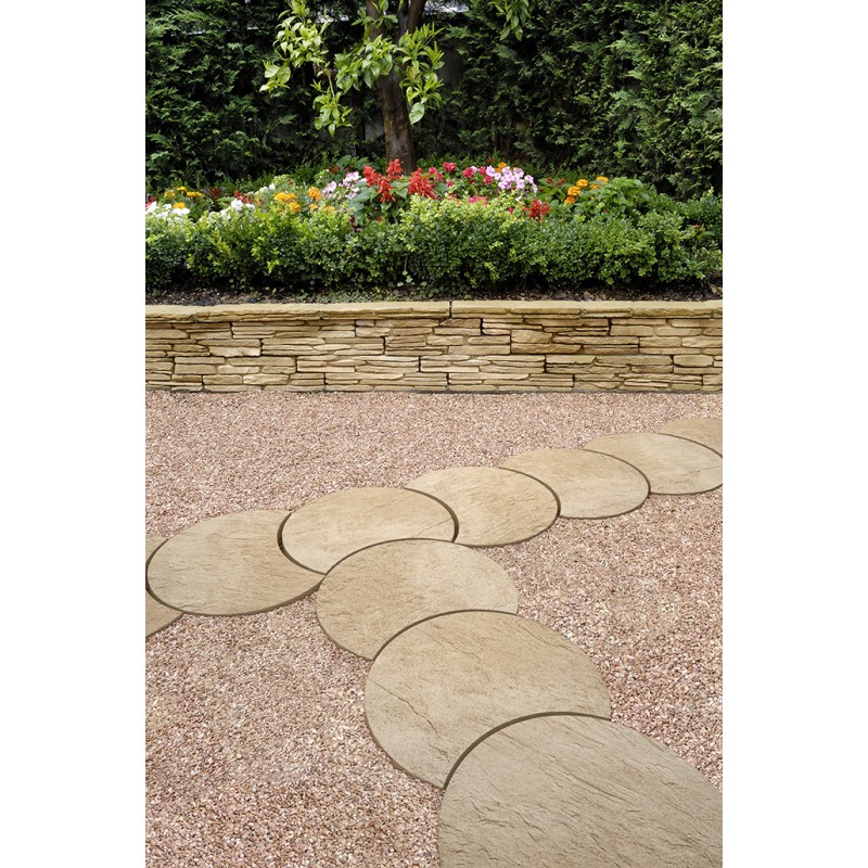 Pas japonais de fabrication vibropressé. Surface structurée en forme de Lune qui permet de faire des sentiers en continue grâce à l'emboitement. coloris sable. dimension 47 x 34 x 3 cm.