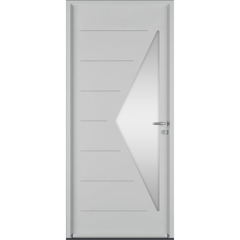 Un vitrage triangulaire affleurant à la tôle souligné par des lignes horizontales, une porte au design bien affirmé. Vitrage classe P2A sablé.