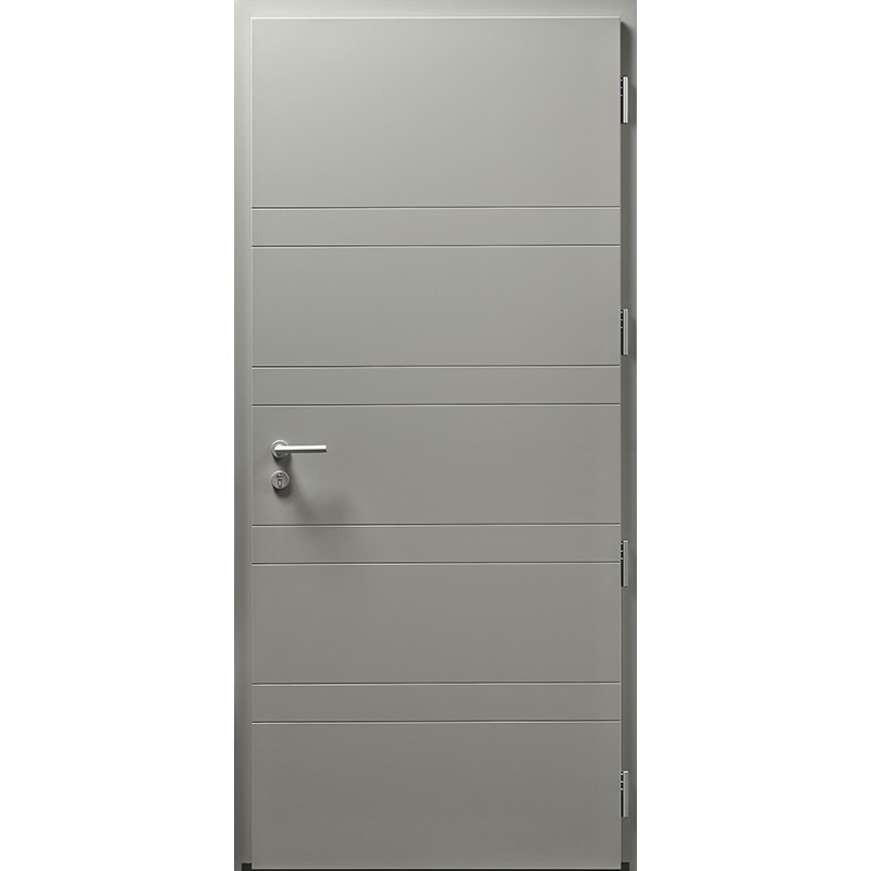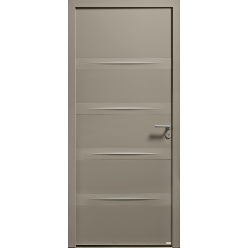 Une porte pleine en Alu 80, présentant des lignes et reliefs subtils ton sur ton avec un effet de matière texturée. Décor extérieur ton sur ton, rappel des lignes horizontales à l'intérieur. Couleur du décor extérieur identique à la porte. Option serrure connectée disponible. Ud = 0,91 W/(m².K). Hauteur : de 1700 mm à 2500 mm. Largeur : de 800 mm à 1200 mm.