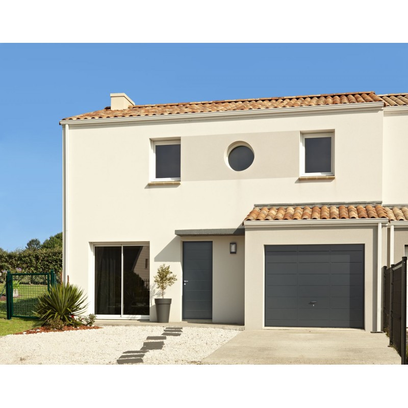 Parement en tôle d’acier galvanisé RAL 9016, simple paroi, finition lisse à 7 fines rainures. Design coordonné avec la porte d’entrée Équation ou Abcisse de chez Bel’M. Possible design Dream.