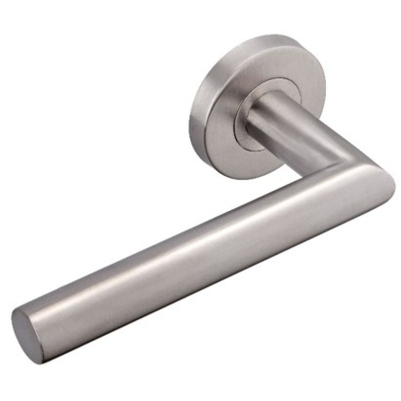 Ensemble béquilles sur rosace ronde bec de cane Application Pour portes épaisseur 30 à 48 mm Construction Ensemble monobloc (béquille et rosace solidarisées) Ressort de béquille intégré Matière Acier inoxydable AISI 201 Finition Inox brossé Fixation Vis traversantes, M4, entraxe 38 mm Système de clipsage invisible de la rosace Carré 7 mm Inclus Adaptateur C7/C8