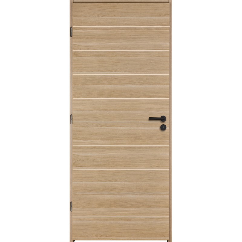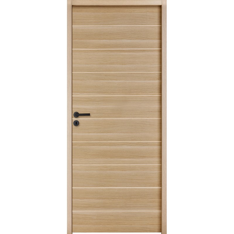 Caractéristique technique : • Âme alvéolaire avec parement en MDF recouvert d’un décor mélaminé • Vantail à recouvrement de 39 mm • Serrure à clef de base • Décor structuré chêne naturel à fil horizontal • 9 rainures horizontales débouchantes (bord à bord de chaque côté du vantail) sur les 2 faces • Huisserie en MDF hydrofuge enrobée d'un décor bois lisse Chêne naturel : › de 72 mm de section 72 x 46 mm pour une cloison de 50 mm (pose sans couvre-joint) ou une cloison de 72 mm en ajoutant un couve-joint. › de 90 mm de section 93 x 46 mm pour une cloison de 72 mm sans couvre-joint. • Joint de frappe périphérique noir. • Disponible en porte seule à rive droite pour système coulissant.