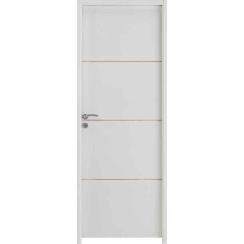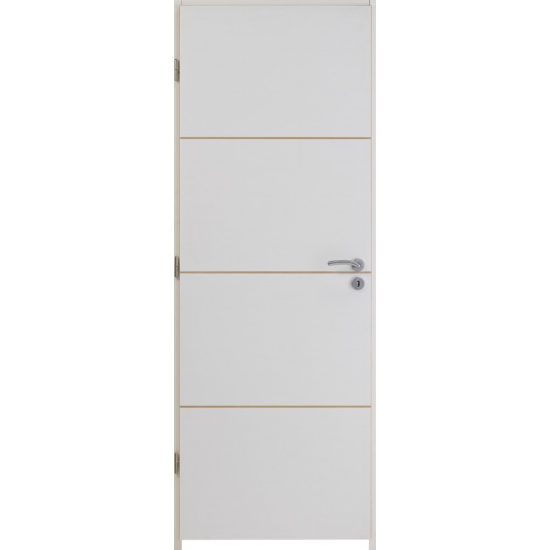 Caractéristiques techniques : OUVRANT - Ame alvéolaire. - Vantail à recouvrement de 39 mm avec faces en MDF recouvertes d'une pré-finition blanche. Les chants bruts laissent apparaître les 2 panneaux MDF et l'alèse en résineux. Pré-finition nécessitant obligatoirement un reprise de finition par le client. - Serrure à clé de base. - Décor réalisé de base sur les deux faces de la porte à partie de rainures de 8 mm de largeur et 1,6 mm de profondeur non reprises en finition et découvrant la fibre brune du panneau MDF. DORMANT - Huisserie en MDF enrobée d'un papier-peint blanc : > de 72 mm de section 72 x 46 mm pour cloison de 50 mm (pose sans couvre-joint) ou cloison de 72 mm en ajoutant un couvre-joint. > de 90 mm de section 93 x 46 mm pour cloison de 72 mm sans couvre-joint. - Huisserie fin de chantier pré-peint blanc pour une épaisseur de de cloison de 50 à 202mm. - Joint de frappe périphérique blanc OPTIONS - Porte seule à rive droite pour système coulissant et rénovation. - Version acoustique ou thermique (L73, 83, 93 cm). - Ame pleine tubulaire en version huisserie fin de chantier ou coulissante (L 73, 83, 93 cm).