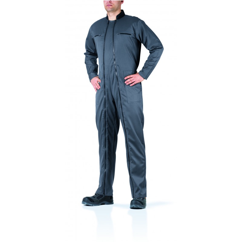 Combinaison 210 g/m2, 65% polyester et 35% viscose. Double fermeture par glissière, taille élastique dans le dos, 2 poches poitrines avec zip, 2 poches avant, 2 poches arrières. Coloris : gris/noir - Tailles disponibles : M à XXL.
