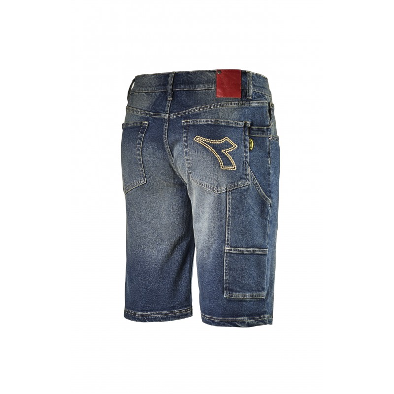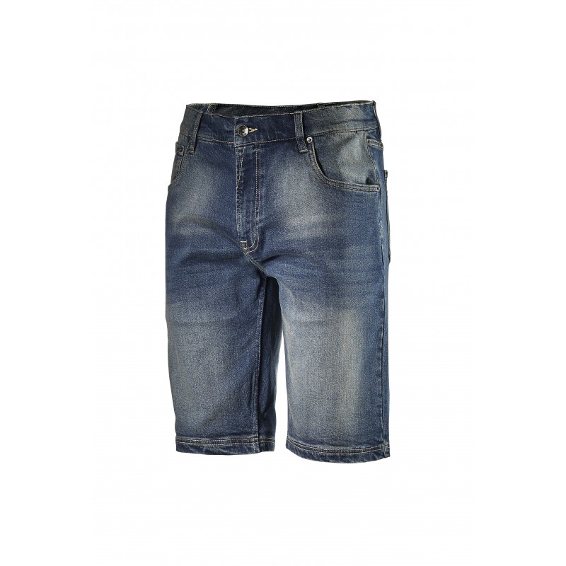 Bermuda en denim élastique, porte-marteau, porte-mètre, lavage stone wash. Composition : Denim 98% coton 2% élasthanne 11 onces (OZ). Tailles : 28/38. Disponible en 1 couleur : C6207 linge sale.