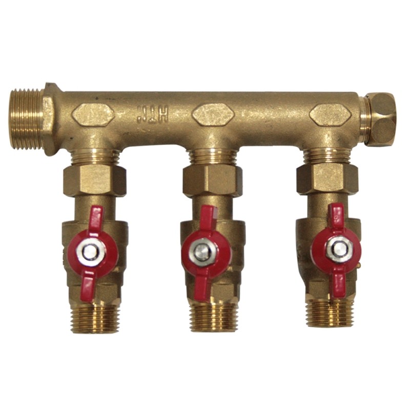Collecteur Boutté mâle 20x27 femelle 15x21 à écrou mobile avec 3 départs mâles 15x21 avec vannes ACS
