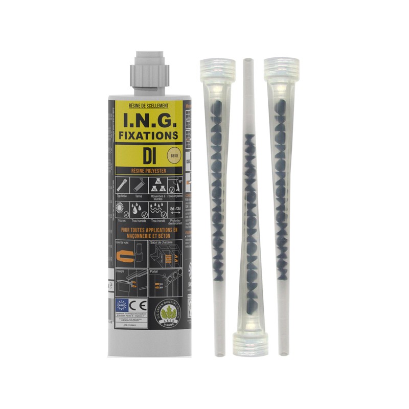 Résine polyester polyvalente tous matériaux. Applications principales : gonds de volets, stores, toutes fixations dans matériaux pleins et creux.