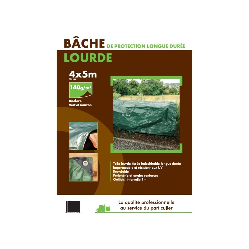 Bâche lourde 140 g/m². Dimensions 4 x 5 m. Toile imperméable, résistante aux UV, œillets aluminium intervalle 1 m, périphérie et angles renforcés, recyclable.