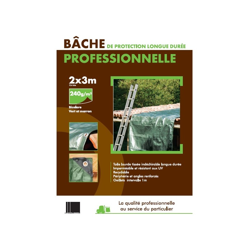 Bâche pro 240 g/m². Dimensions 2 x 3 m. Toile imperméable, résistante aux UV, œillets aluminium intervalle 1 m, périphérie et angles renforcés, recyclable.