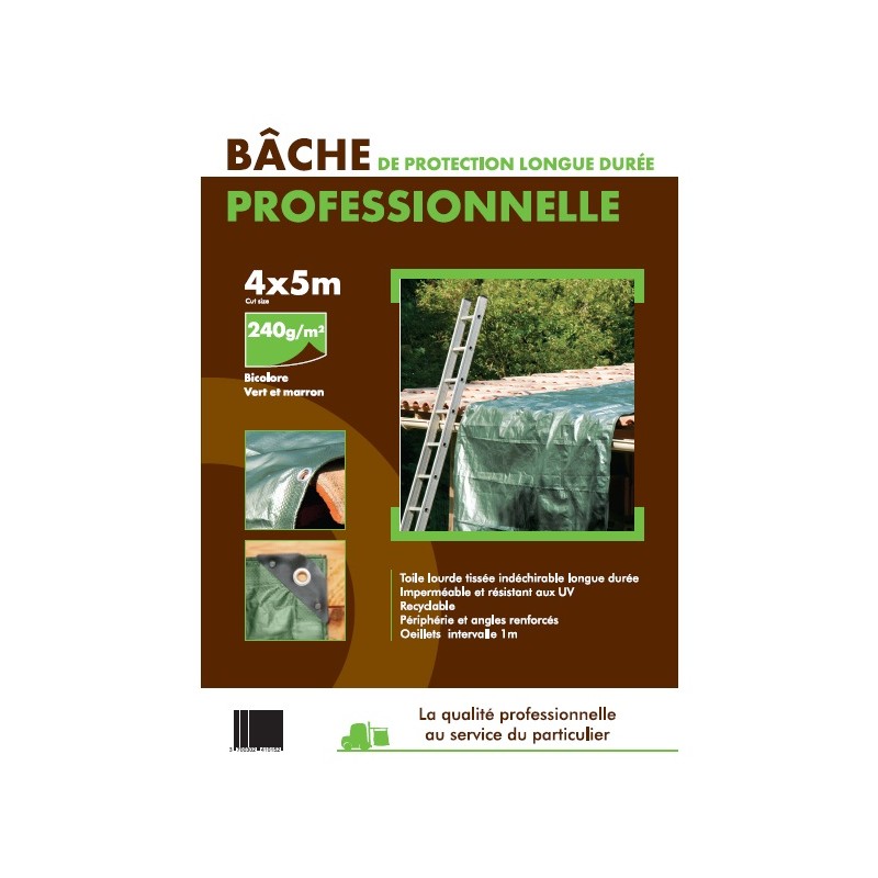 Bâche pro 240 g/m². Dimensions 4 x 5 m. Toile imperméable, résistante aux UV, œillets aluminium intervalle 1 m, périphérie et angles renforcés, recyclable.