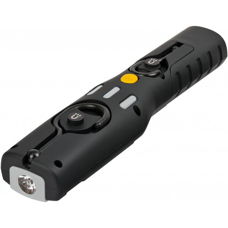 2 crochets pivotant à 360° et 2 aimants intégrés au dos. Contenu du colis : 1x Lampe torche 6+1 LED rechargeable, 500 lumen + 1x batterie Li-Ion 2,5Ah intégrée avec témoin de charge + 1x câble de raccordement + 1x notice.