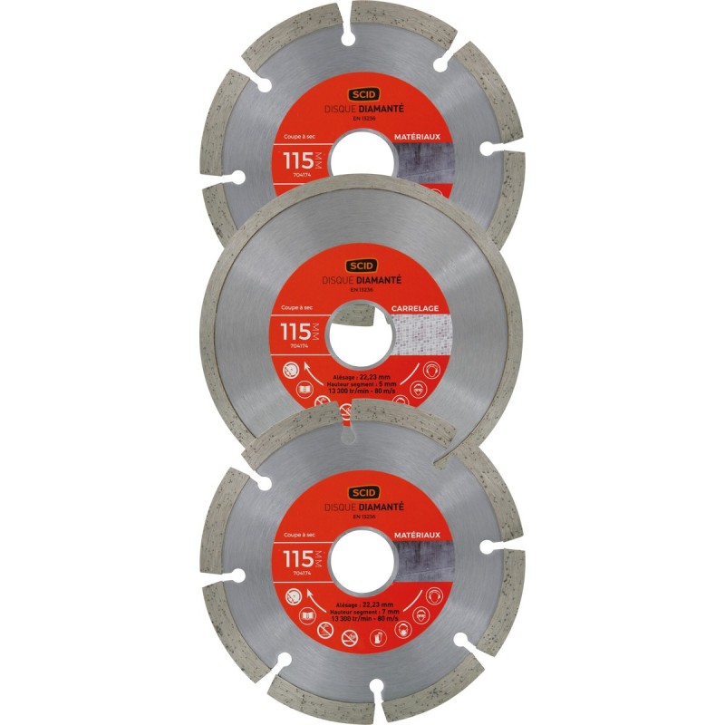 Lot de 3 disques : deux disques standards avec couronne segmentée, hauteur de segment 10 mm et un disque carreleur jante continue, hauteur de la jante 5 mm