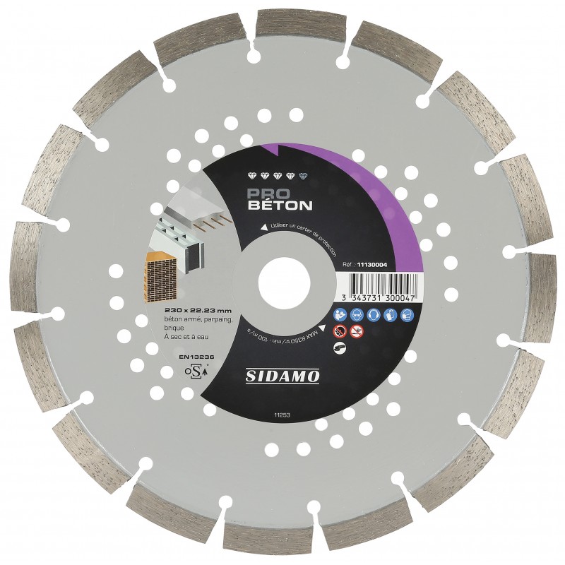 Disque à segments soudés laser. Adapté aux travaux de coupe à sec et à eau de matériaux. Existe en Ø 115, 125, 300, 350, 400, 450, 500, 600 mm.