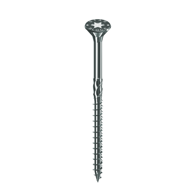 Vis Starblock TX acier zingué. Tête fraisée, double cône sous tête, moletage, filetage profond et pointe entaillée. Pour tous bois, contreplaqués, agglomérés, mélaminés…